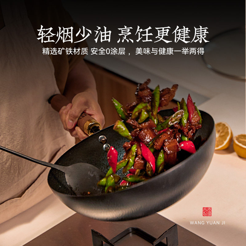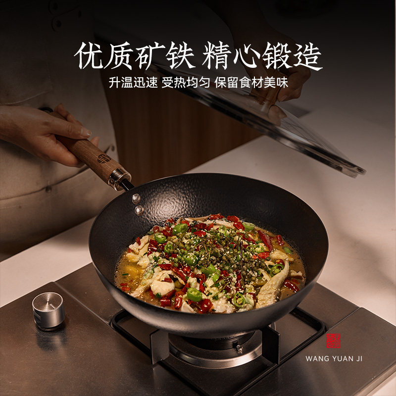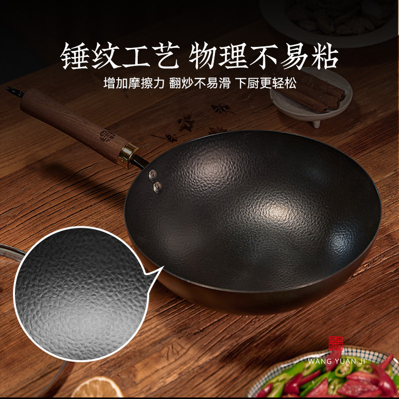 为您提供商品王源吉铁锅无涂层不粘锅锤纹精铁小炒锅家用炒菜一人食电磁炉通用的详细介绍,