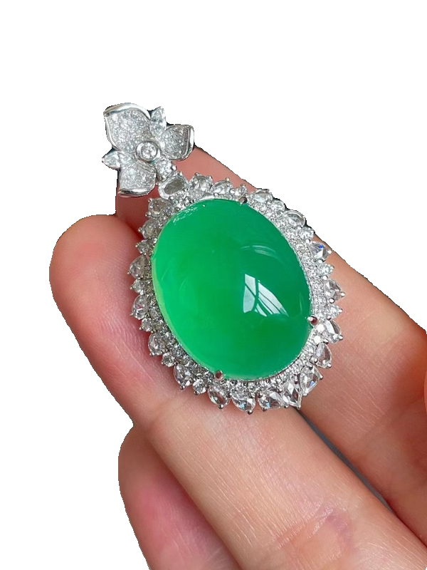 18k白金奢华镶钻 木那阳绿鸽子蛋翡翠吊坠冰种冰阳绿翡翠蛋面挂件由