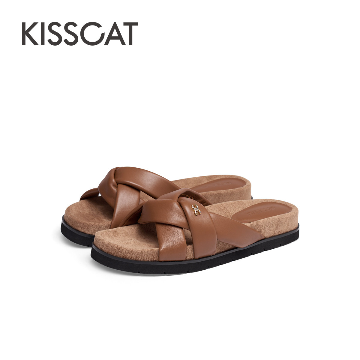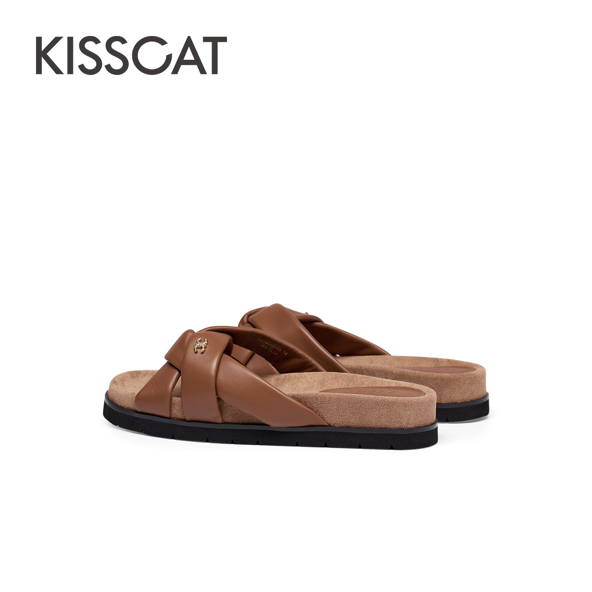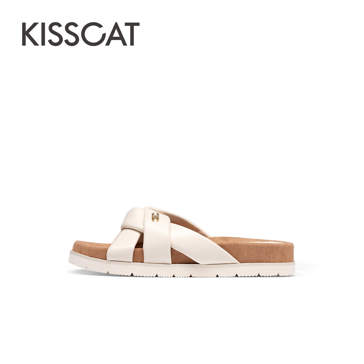 KISSCAT接吻猫夏季 度假风平底真皮凉拖鞋 女厚底羊皮勃肯拖鞋 法式