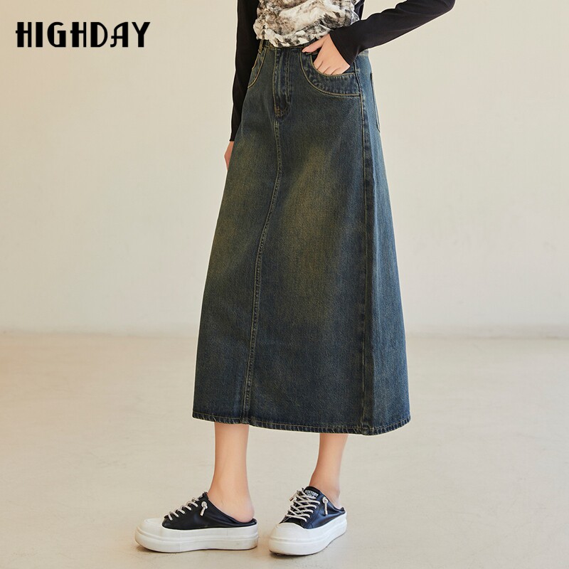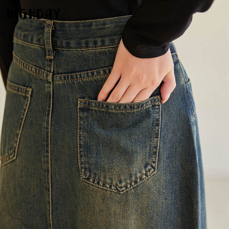 高腰开叉牛仔裙女做旧设计口袋过膝半身裙 highday轩日2024秋新款