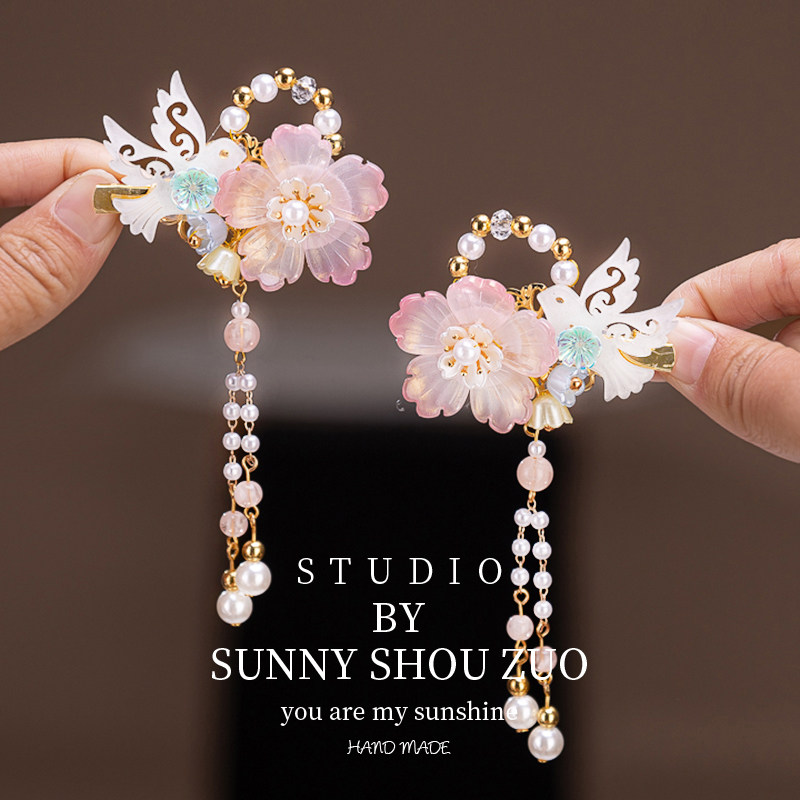 粉色蝴蝶结头饰对夹汉服小女孩头饰 中国风可爱仙气发夹女儿童古装由