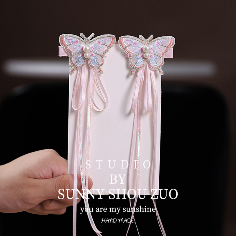 粉色蝴蝶结头饰对夹汉服小女孩头饰 中国风可爱仙气发夹女儿童古装