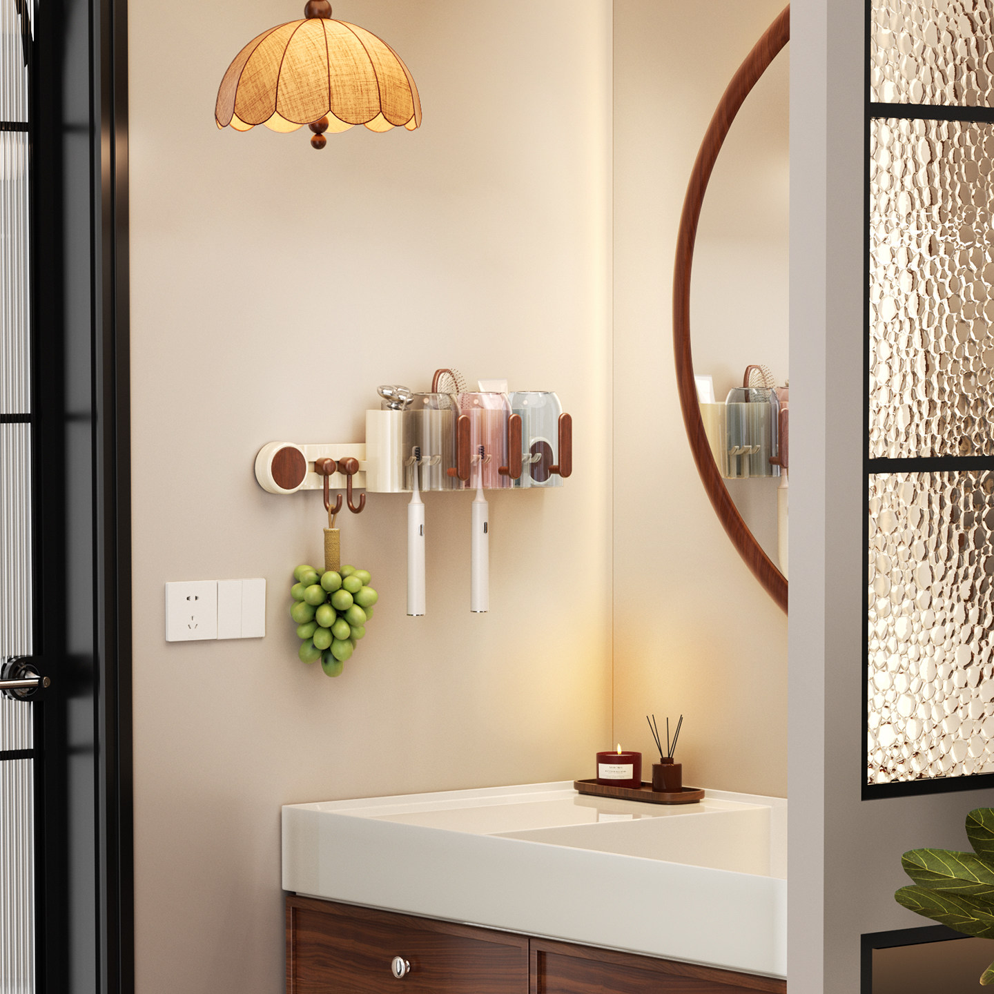 免打孔卫生间牙膏漱口杯收纳牙刷架子 中古风吸盘牙刷置物架壁挂式