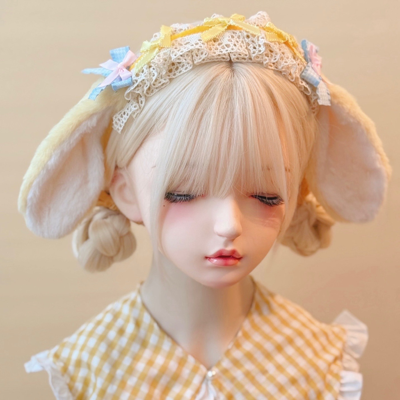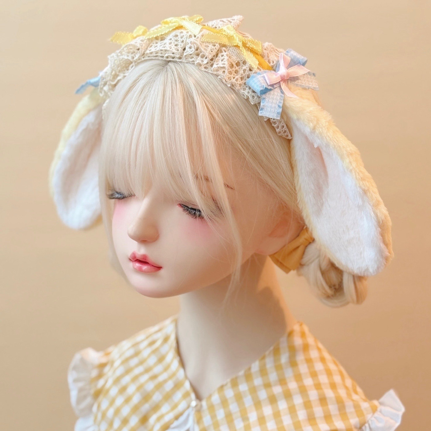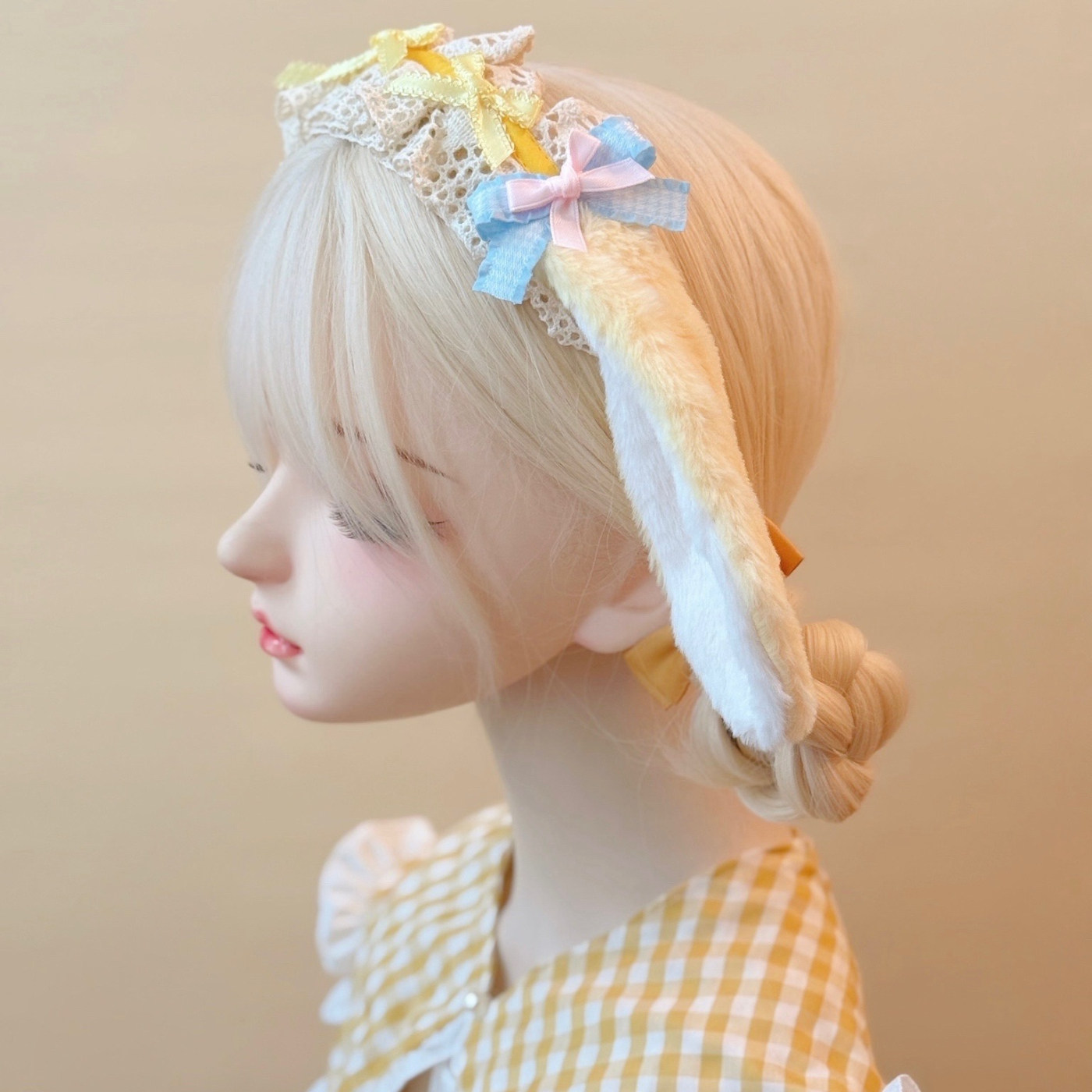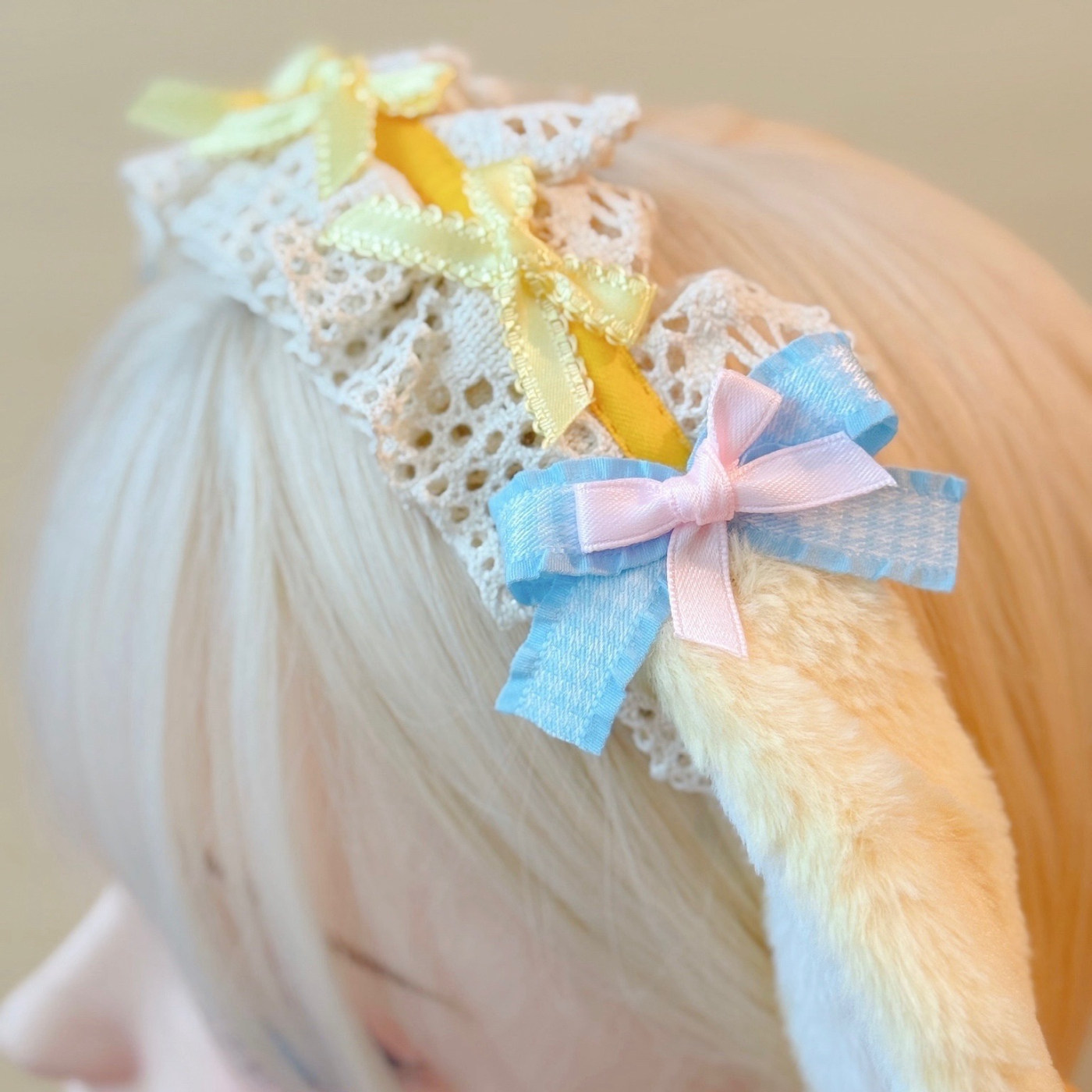本守造原创手工蝴蝶结蕾丝毛绒垂耳兔发箍兽耳lolita毛绒kc黄色由