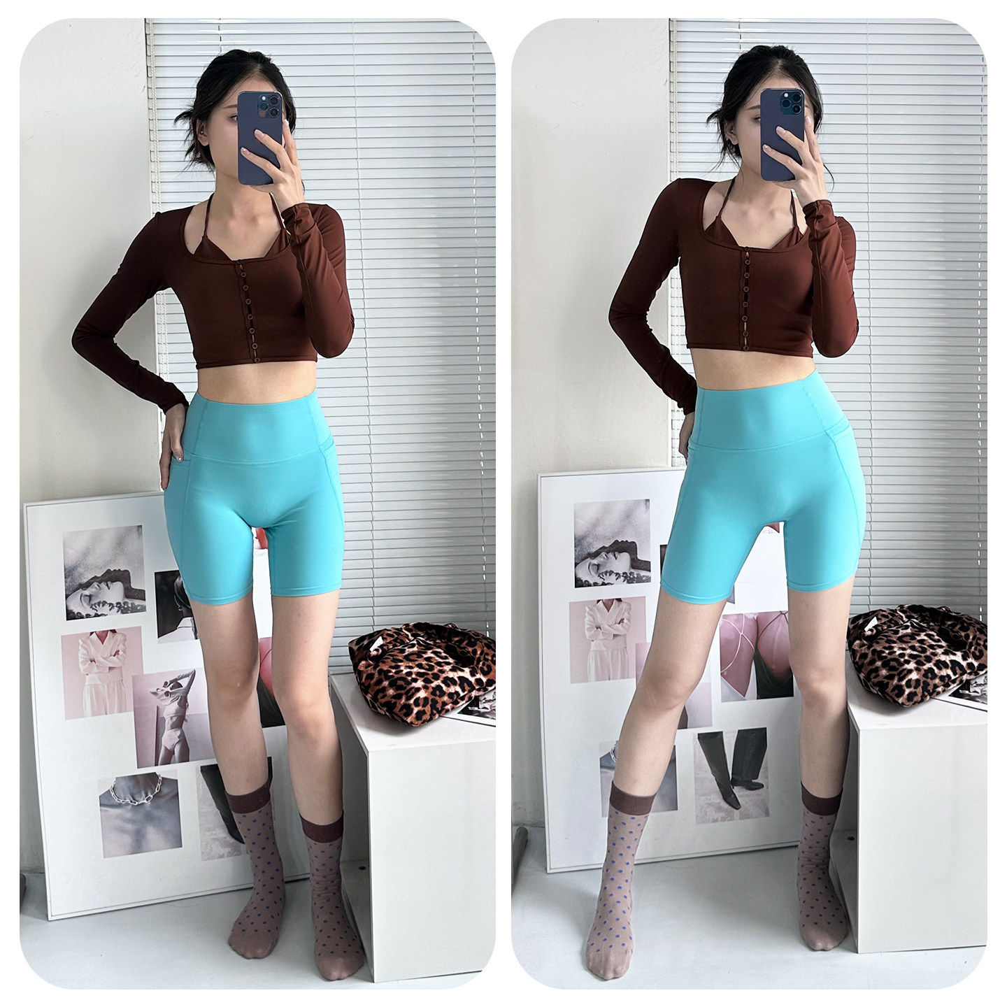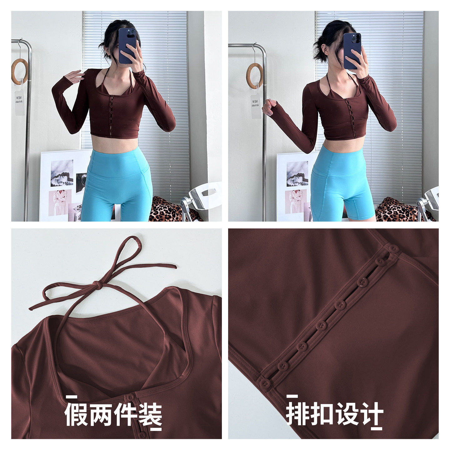 修身 上衣 显瘦健身服露脐挂脖假两件辣妹瑜伽服专业跑步带胸垫长袖由