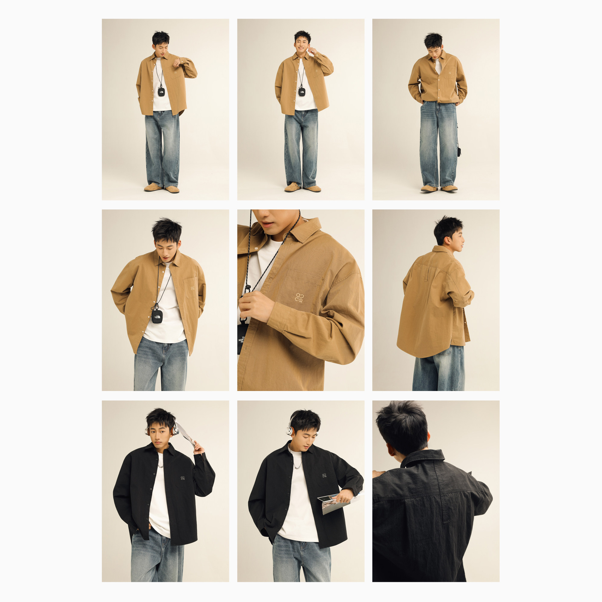蓝色翻领水洗牛仔衬衫 秋季 宽松休闲纯色长袖 上衣外套 男生2026新款