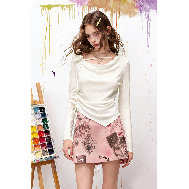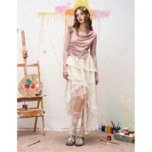 t恤女2026年早春新款 气质纯欲上衣 口袋不规则粉色荡领长袖 妖精