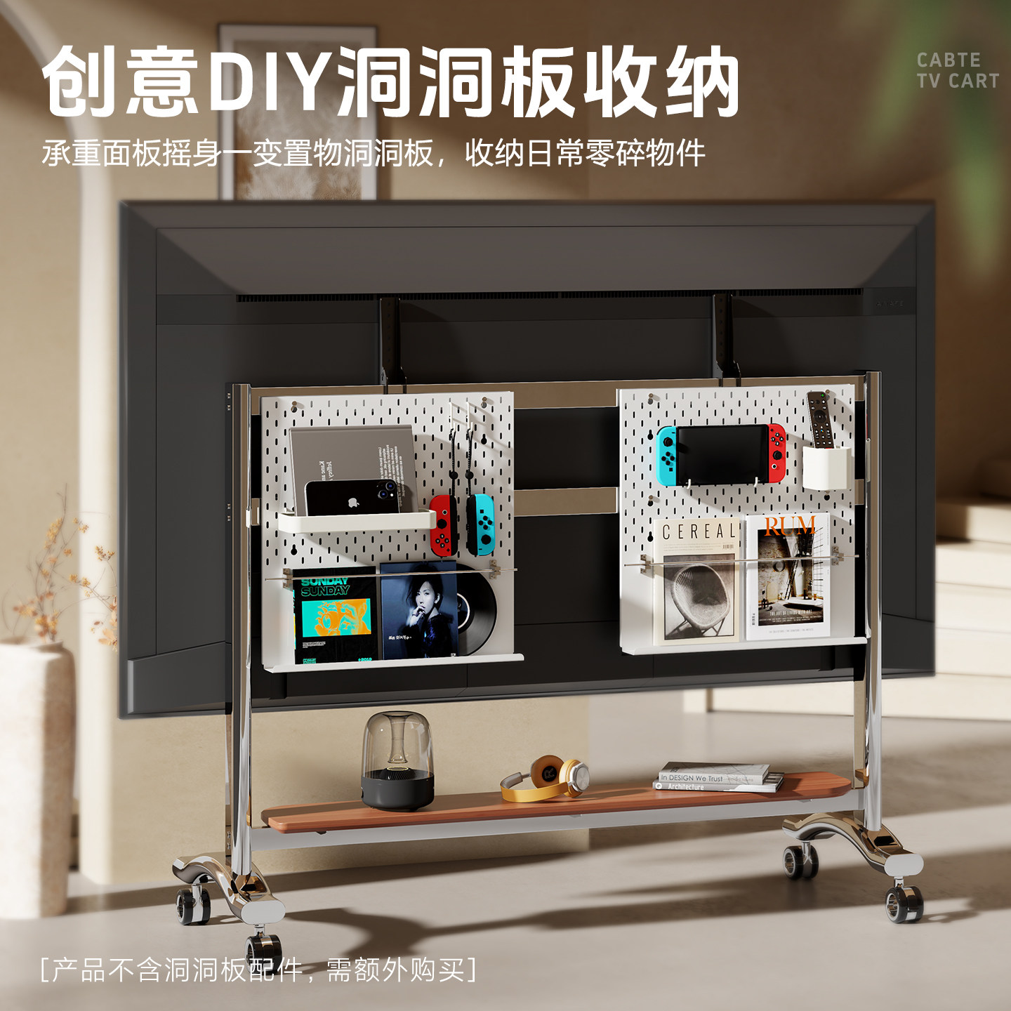 120寸 政府补贴CABTE可移动电视柜实木带轮推车不锈钢艺术支架55由