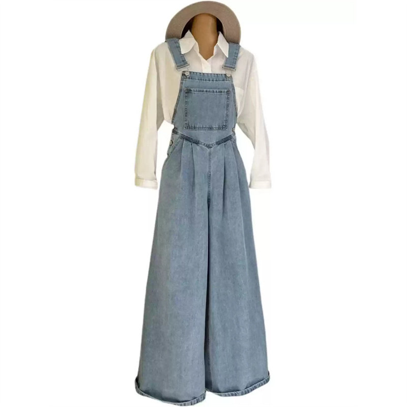长裤 2025夏季 子 背带裤 慵懒减龄高腰浅蓝色牛仔阔腿裤 新款 复古美式