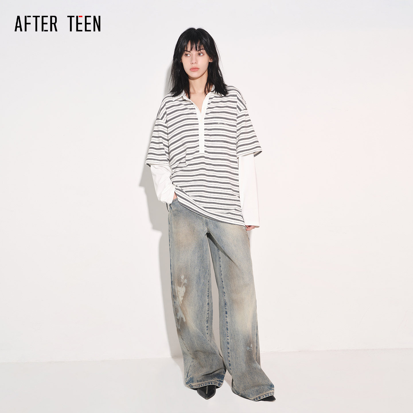 渐变钉钻印花廓形T恤 AFTER TEEN条纹廓形拼接袖 T恤 晕染牛仔裤