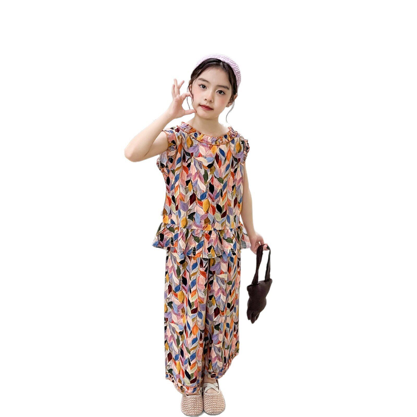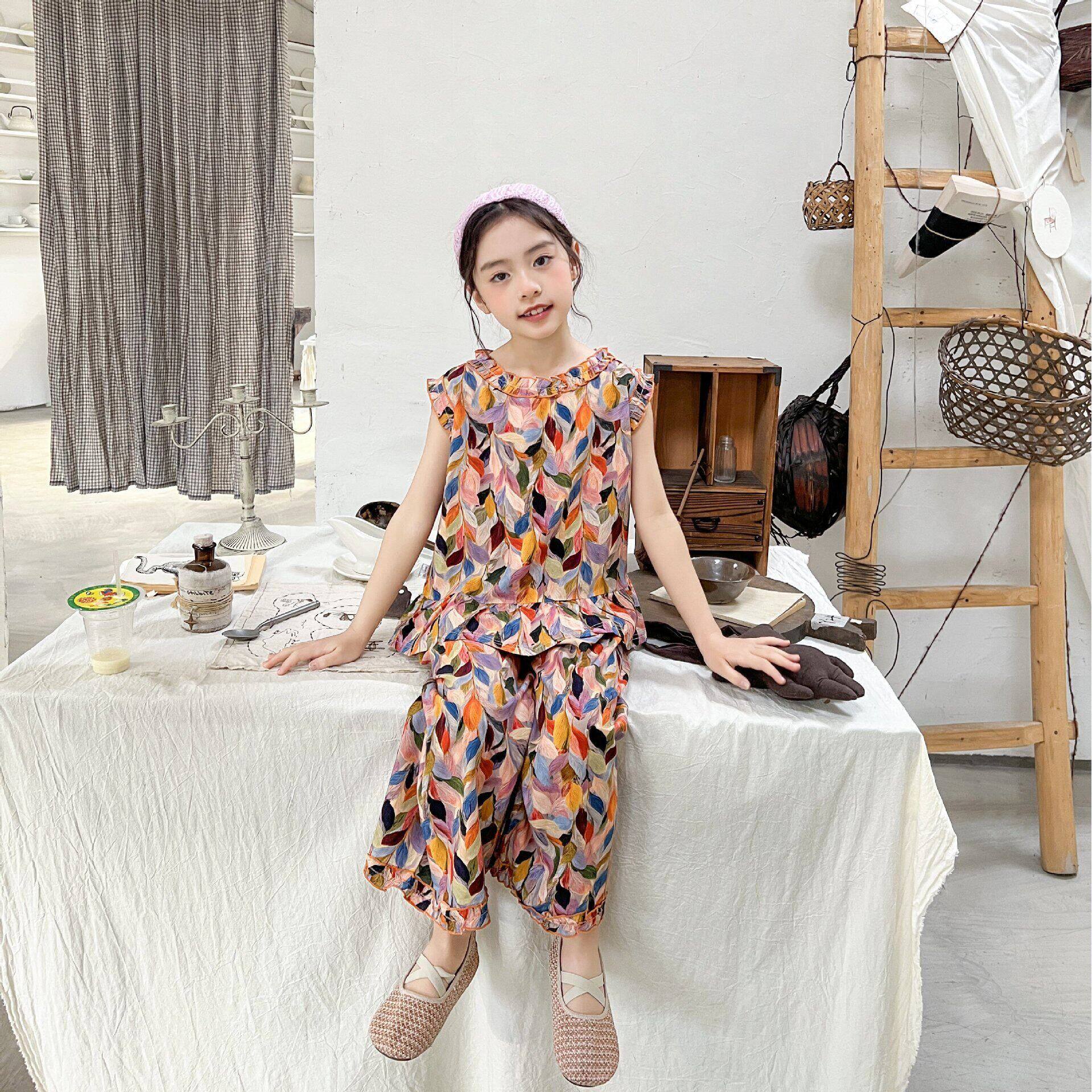 凉快宝宝洋气碎花童套装 女童套装 两件套薄款 儿童上衣长裤 夏装 无袖