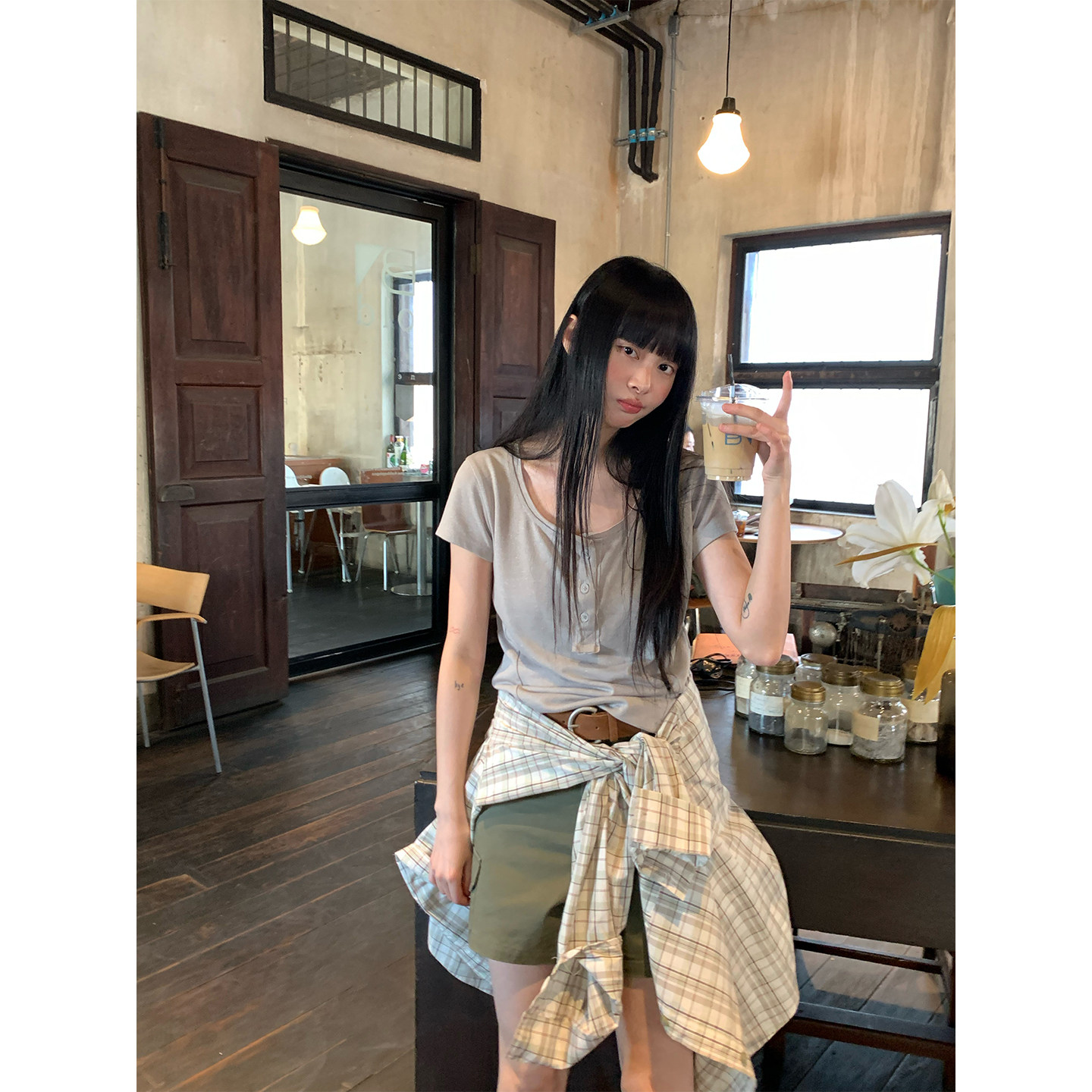 新款 休闲舒适T恤女 2026夏季 CCKOK松弛慵懒感亚麻纯色大领口短袖