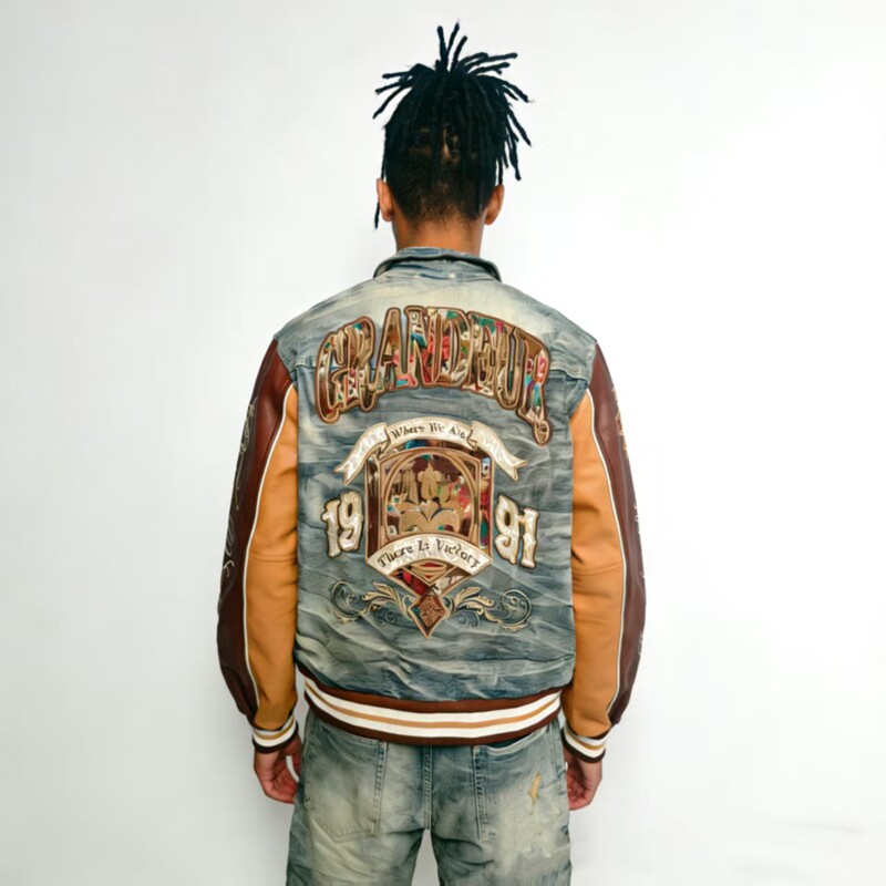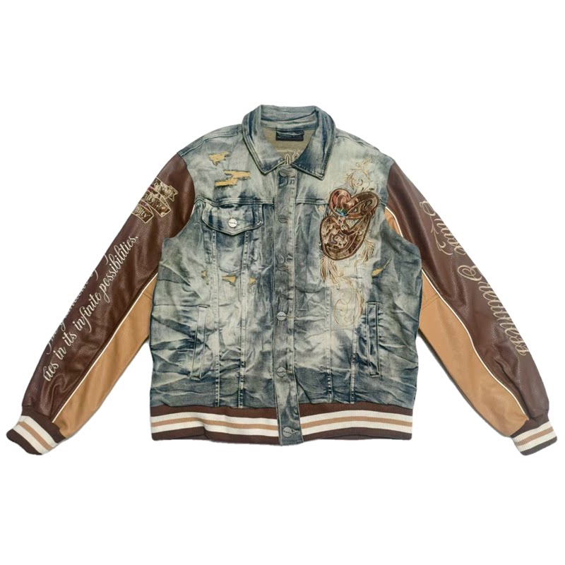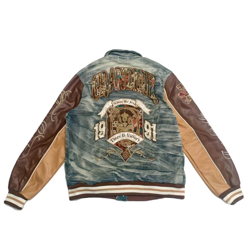 美式 美版 牛仔外套 拼接 万针刺绣 嘻哈街头hiphop说唱 做旧水洗由