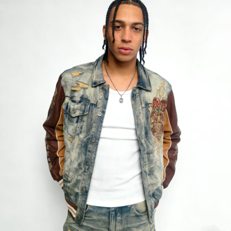 美式 美版 牛仔外套 拼接 万针刺绣 嘻哈街头hiphop说唱 做旧水洗