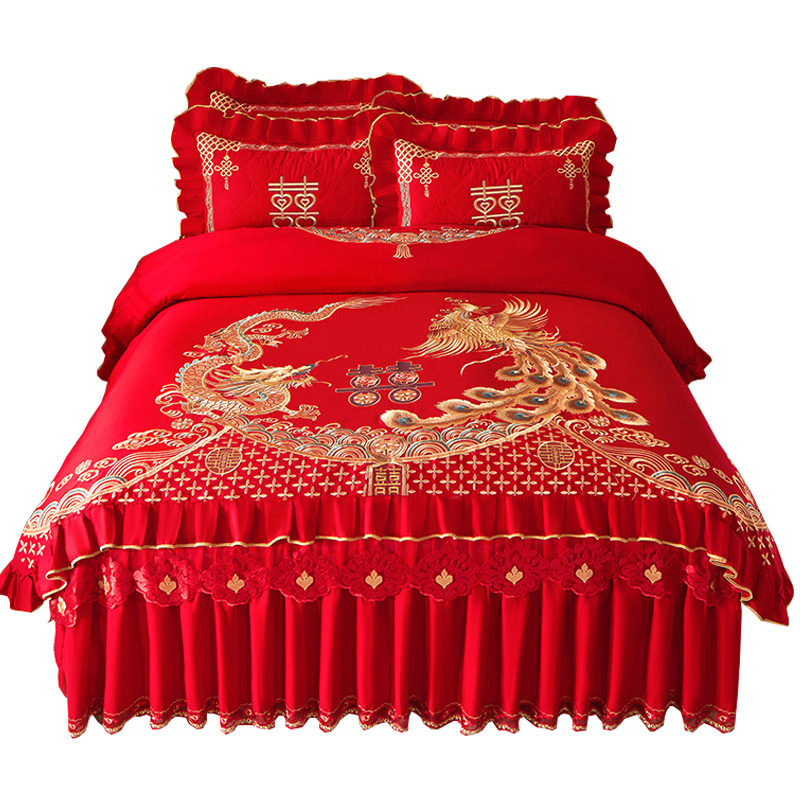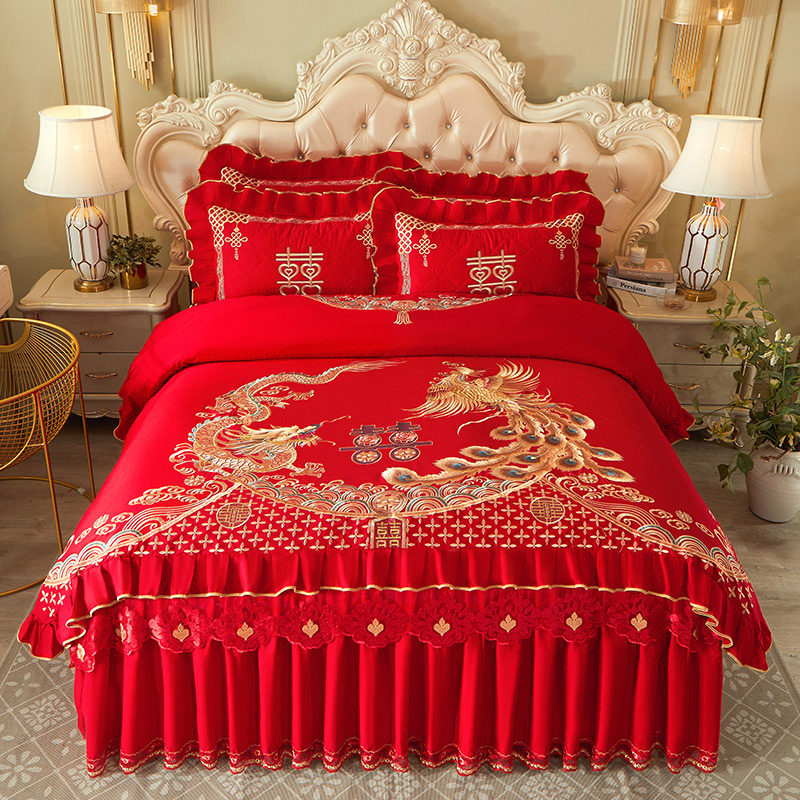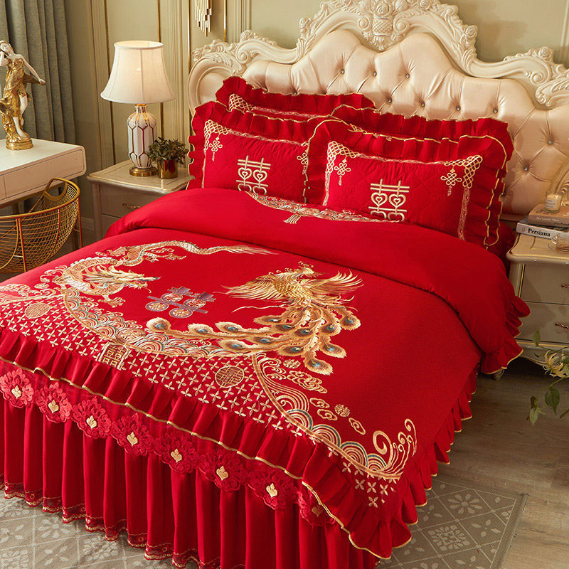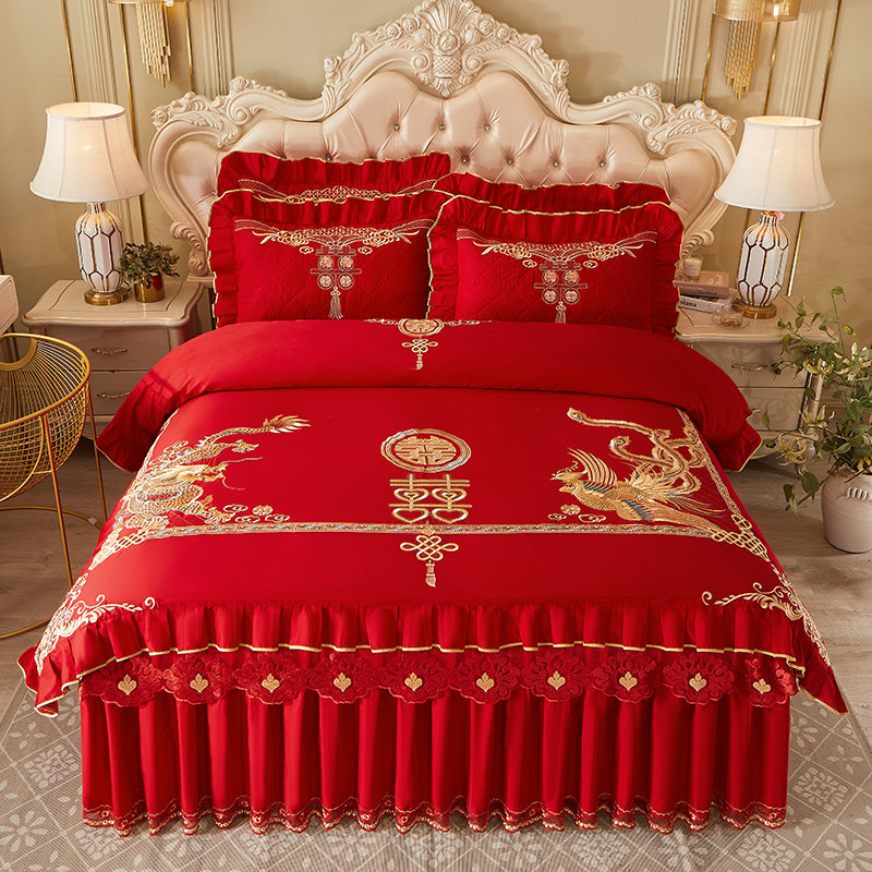 大红i色婚庆四件套纯棉喜庆1.8m床罩单双人被罩加厚床 全棉床裙式