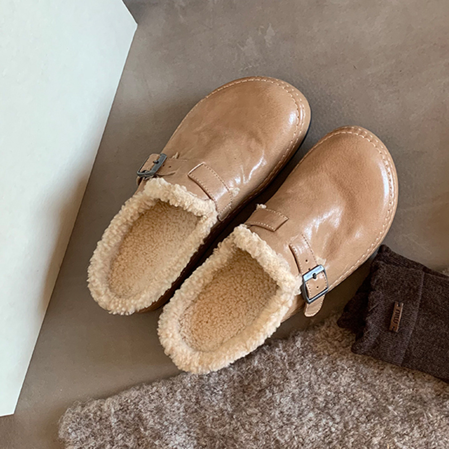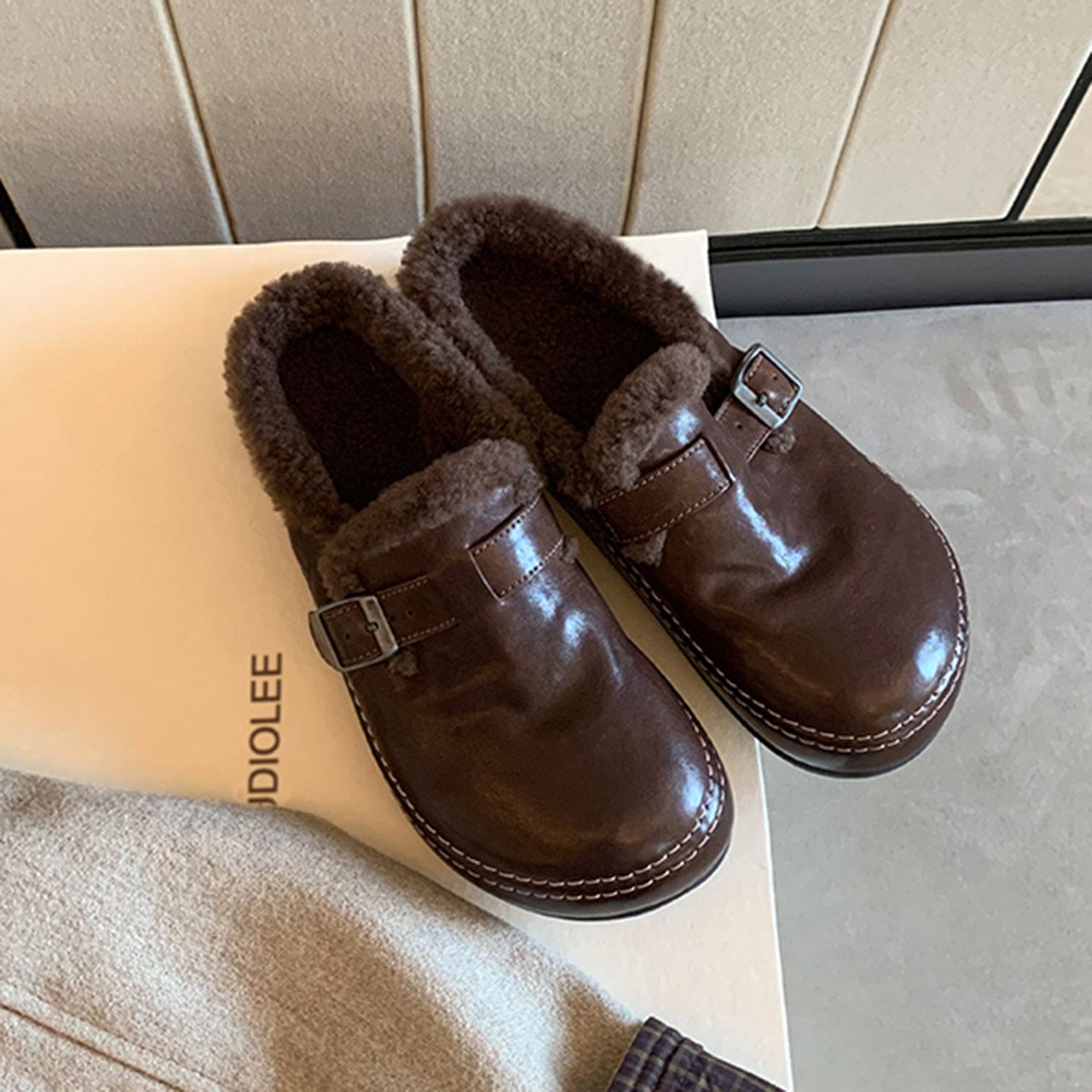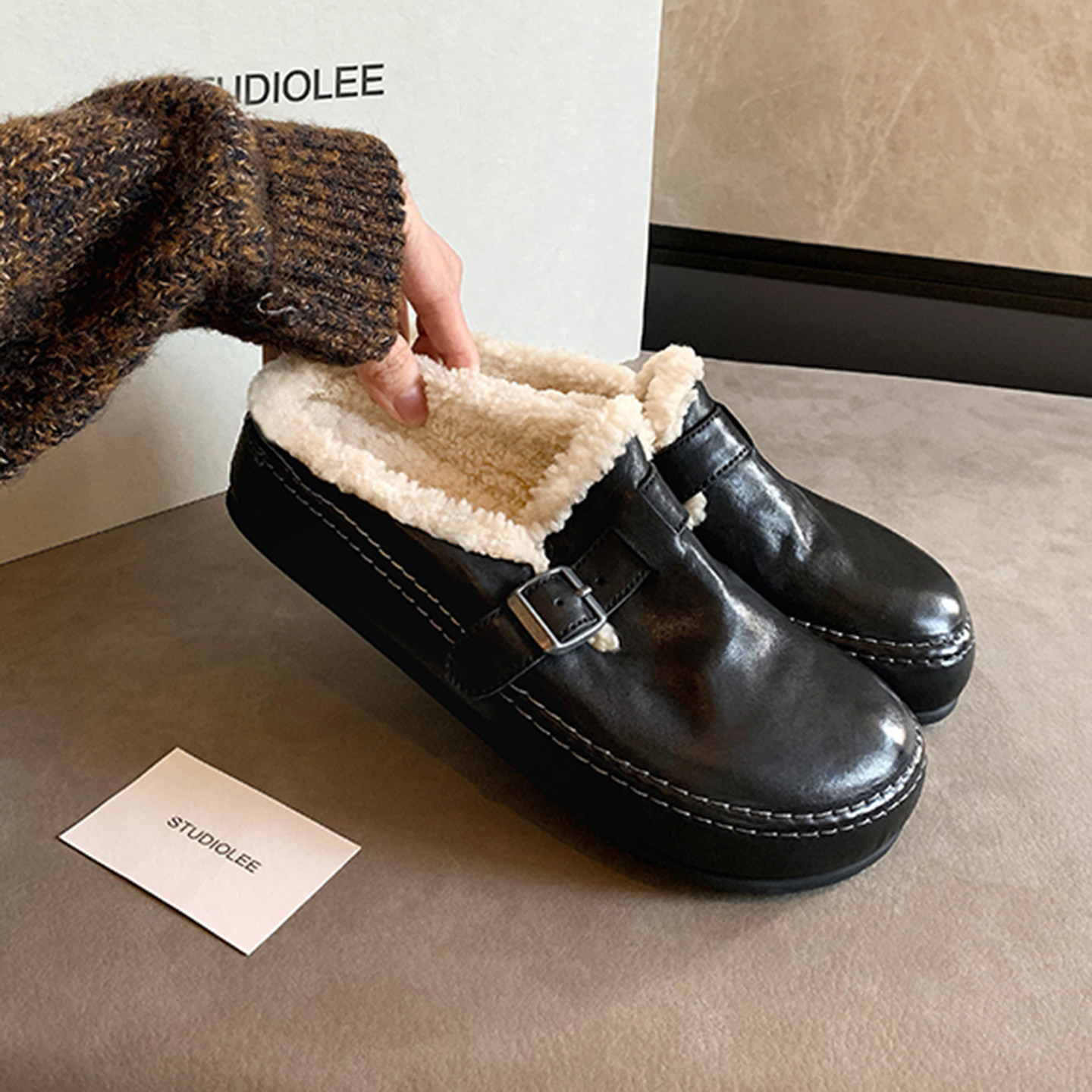 女外穿秋冬新款 复古皮带扣一脚蹬包头棉拖 加绒勃肯半拖鞋 马皮版