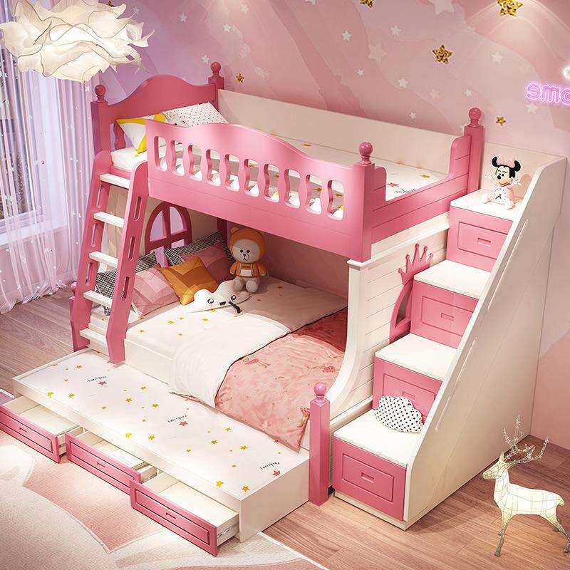 上下铺双层床粉色儿童床两层上下床公主床滑滑梯床木床女孩高低床由