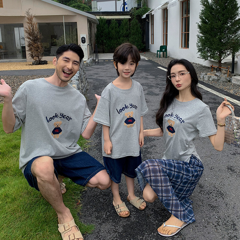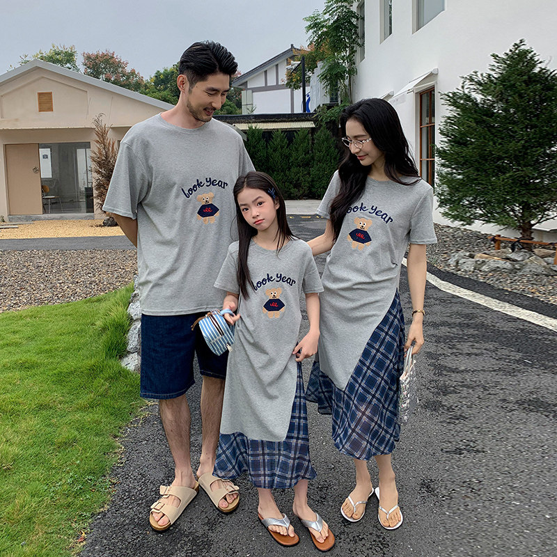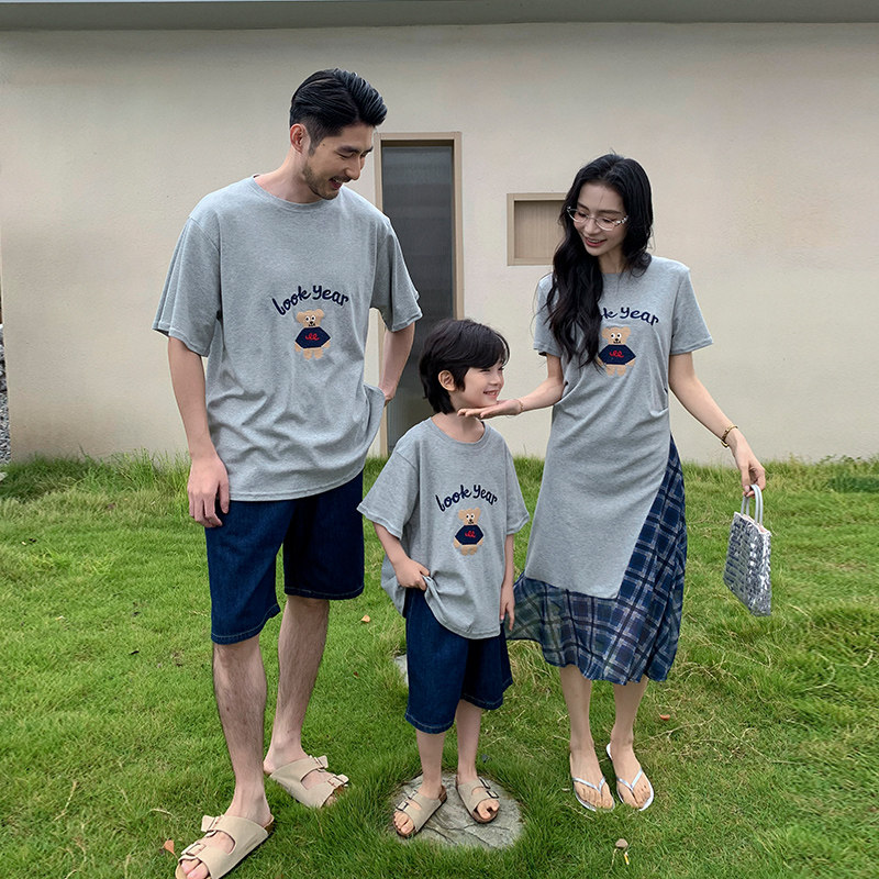 亲子装 一家三四口小熊刺绣灰色纯棉短袖 T恤母女连衣裙家庭装 夏装由