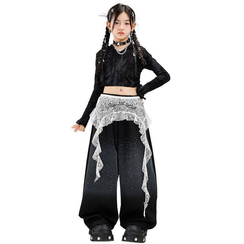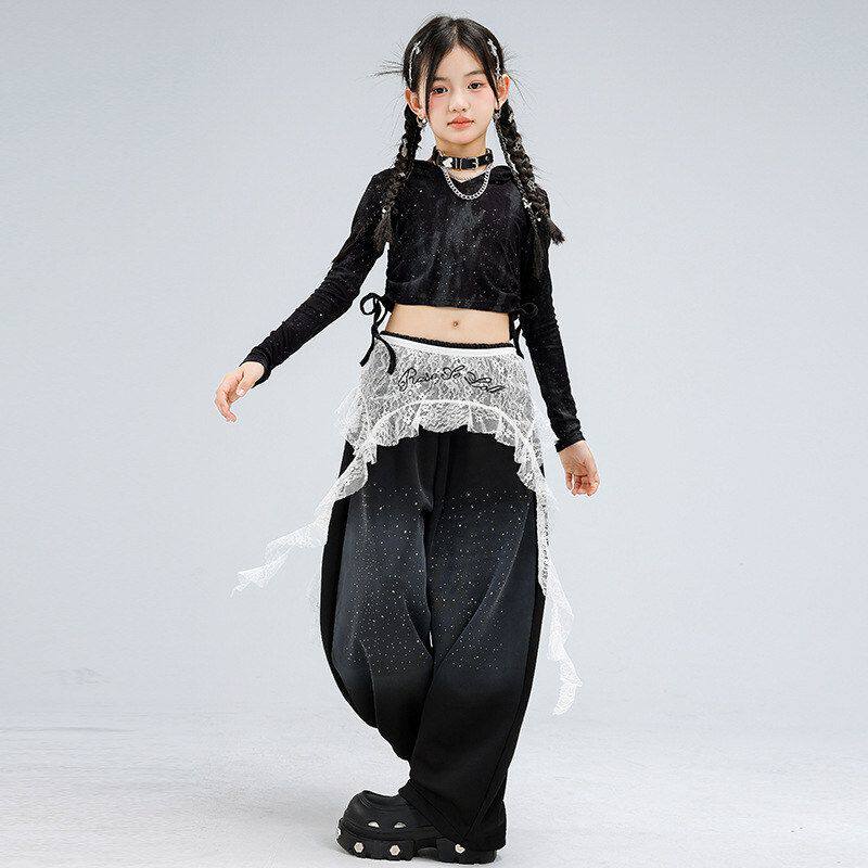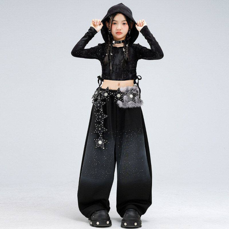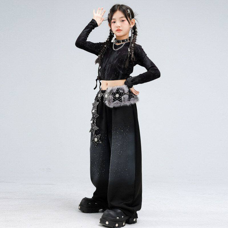 爵士舞女童服装 jazz走秀街舞潮服表演服女 露脐黑色闪钻舞蹈服套装