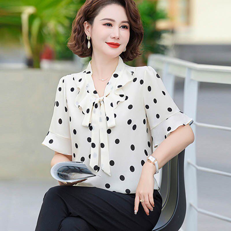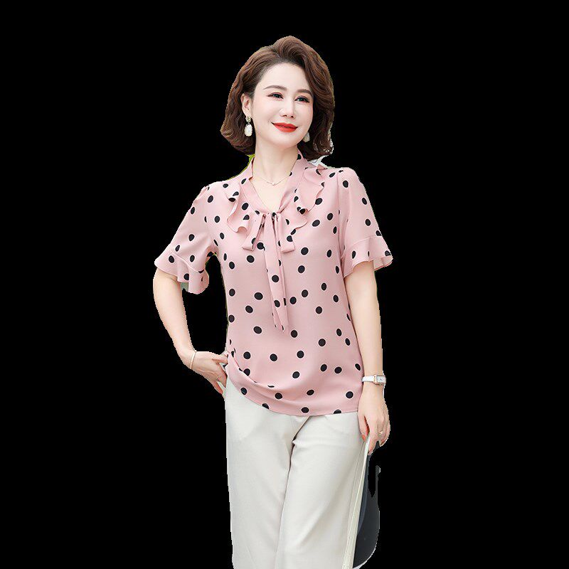 中老年洋气短袖 妈妈夏装 波点雪纺小衫 2024新款 T恤上衣女两件套装由