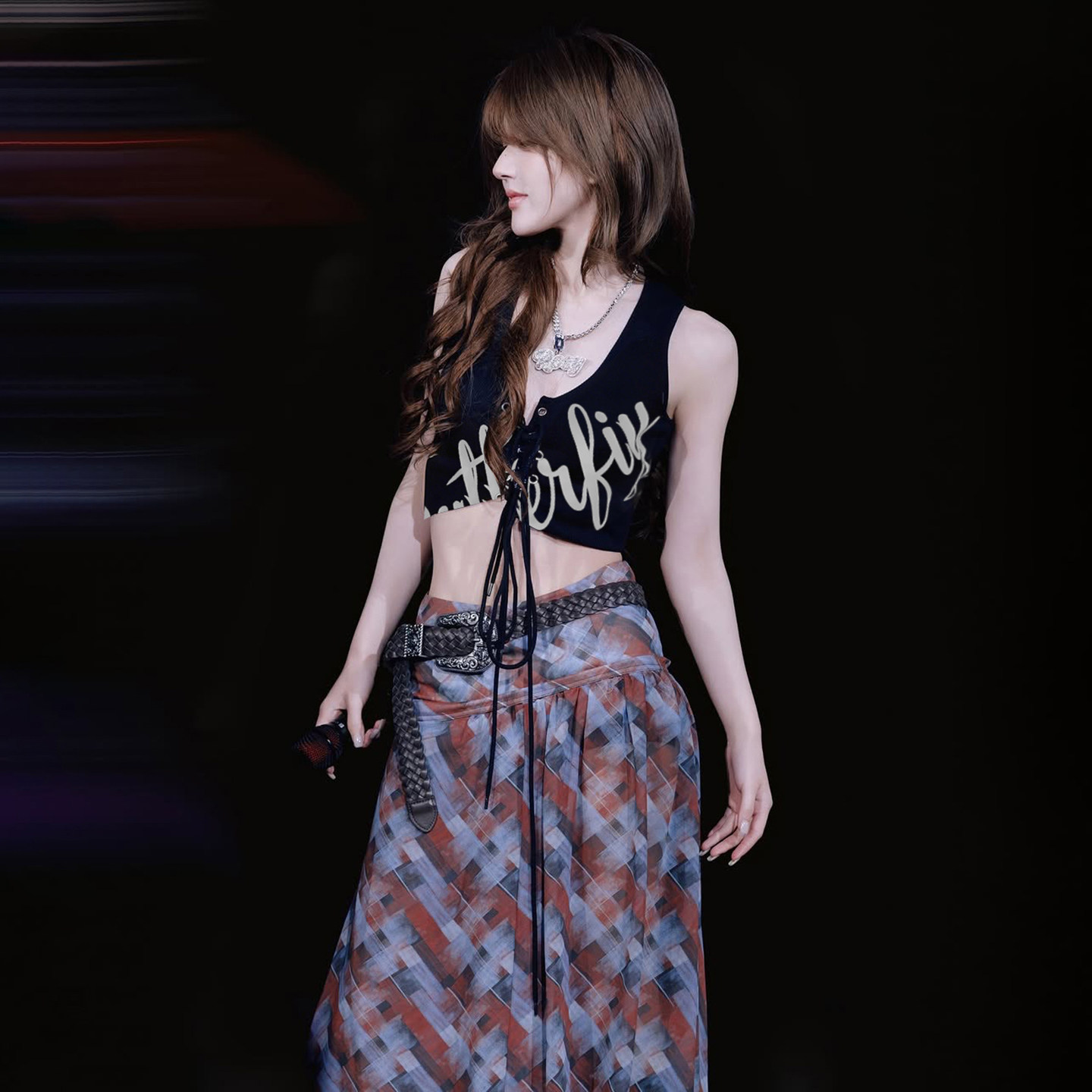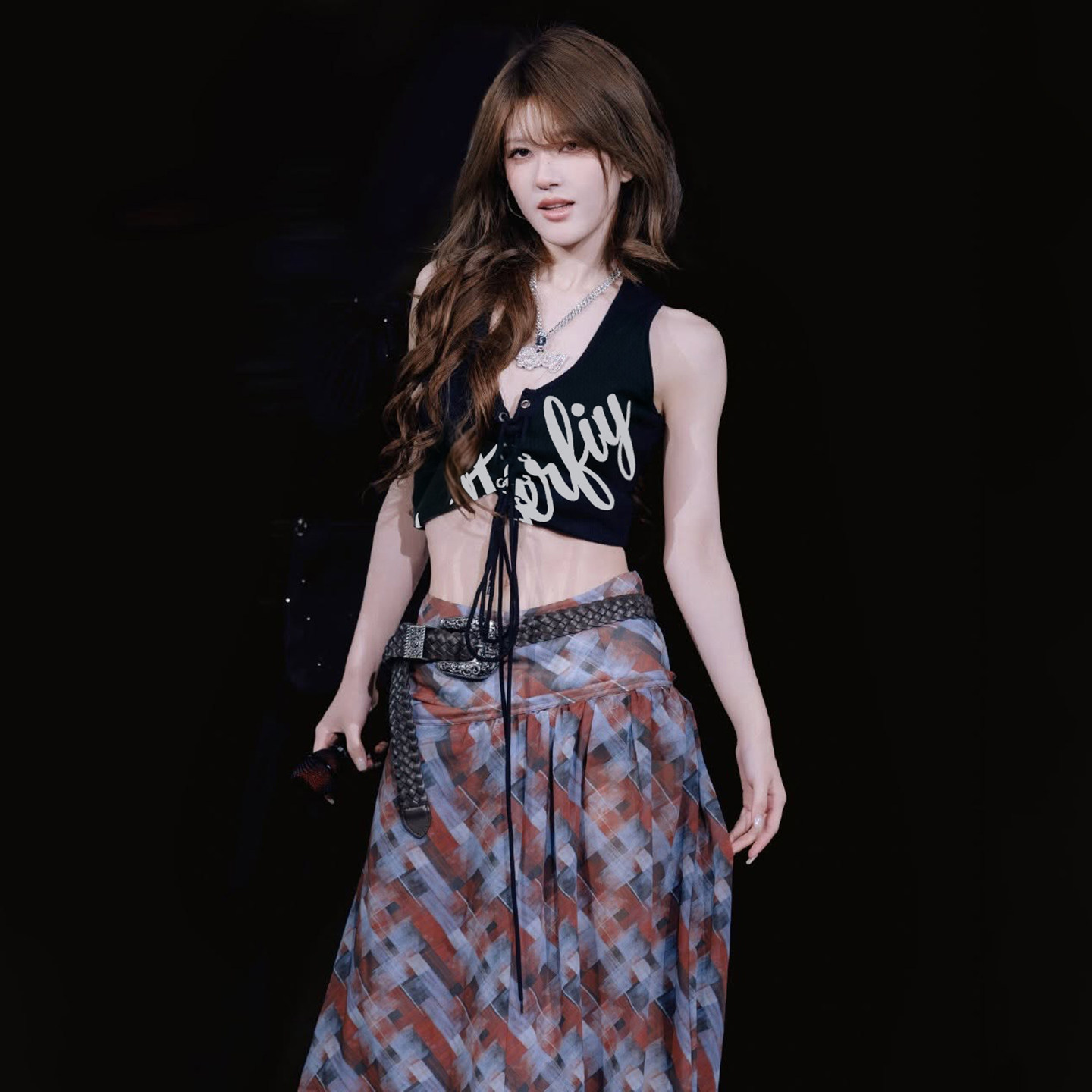赵露思Rosy偶像idol风字母印花挂脖吊带格纹半身裙两件套 SylCue