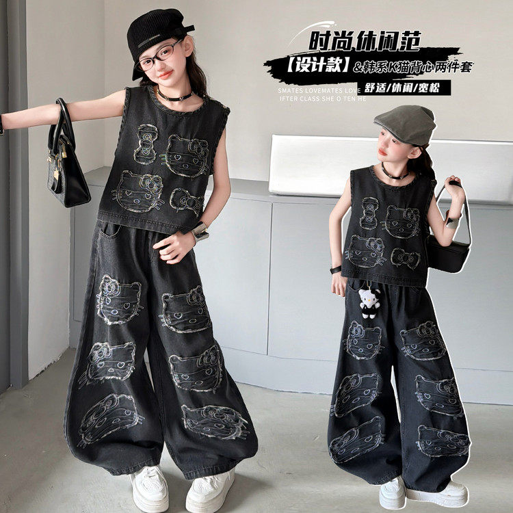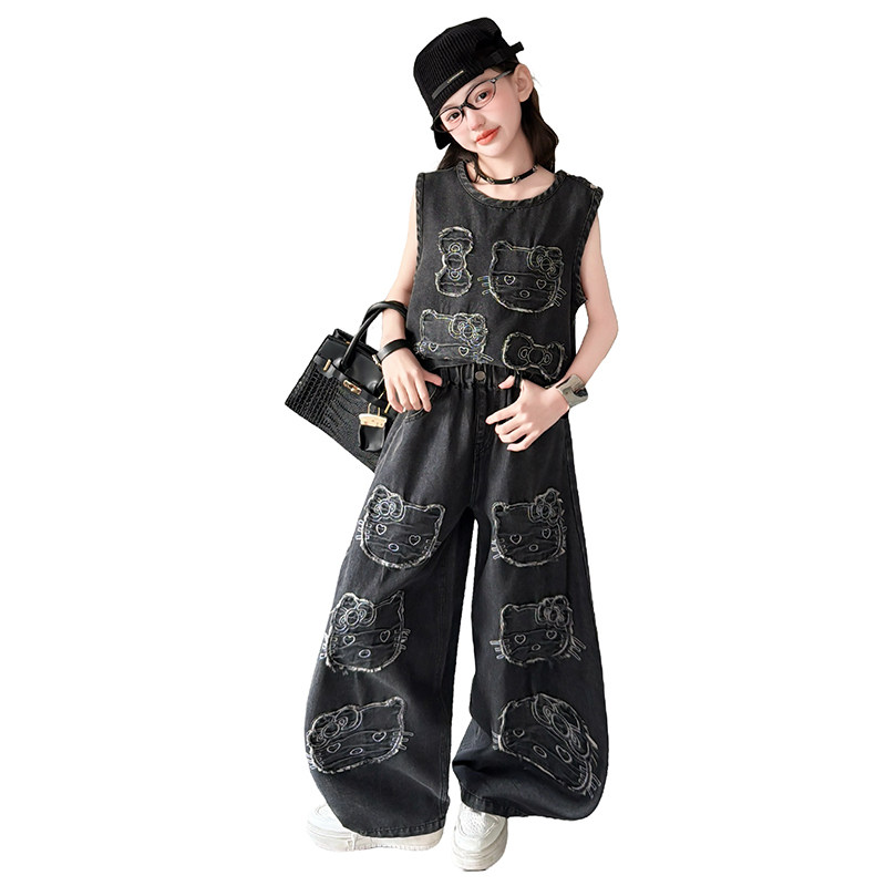 女童卡通猫咪贴补牛仔裤 洋气2026新款 春夏儿童无袖 上衣两件套 套装
