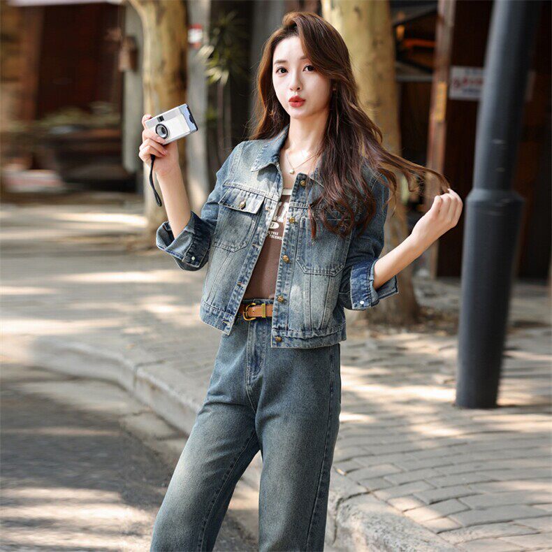 为您提供商品洋气减龄短款 高级感牛仔套装 女秋季 时尚 两件套 外套阔腿裤的详细介绍,