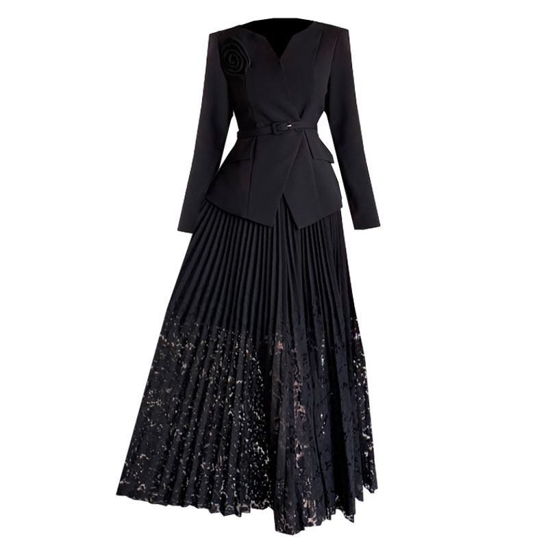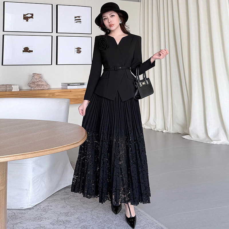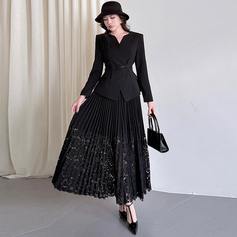 长袖 上衣蕾丝百褶半身裙套装 时尚 洋气减龄显瘦遮肉两件套秋冬 修身