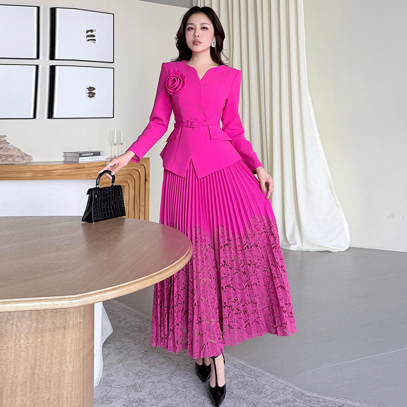 长袖 上衣蕾丝百褶半身裙套装 时尚 洋气减龄显瘦遮肉两件套秋冬 修身由