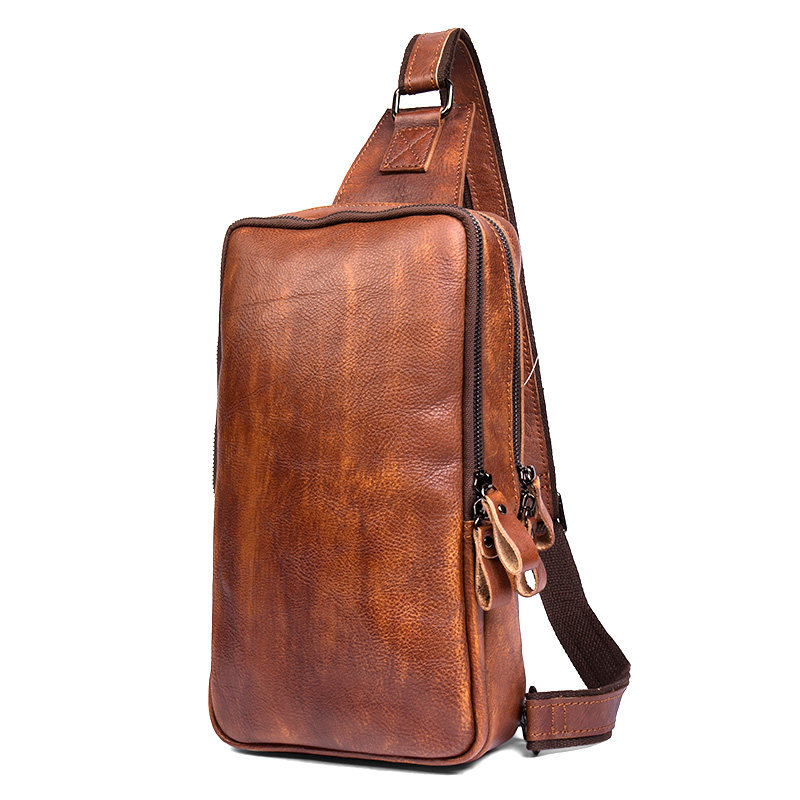 植鞣牛皮男包潮流胸包头层牛皮单肩包手工擦色腰包真皮斜挎包 新品由