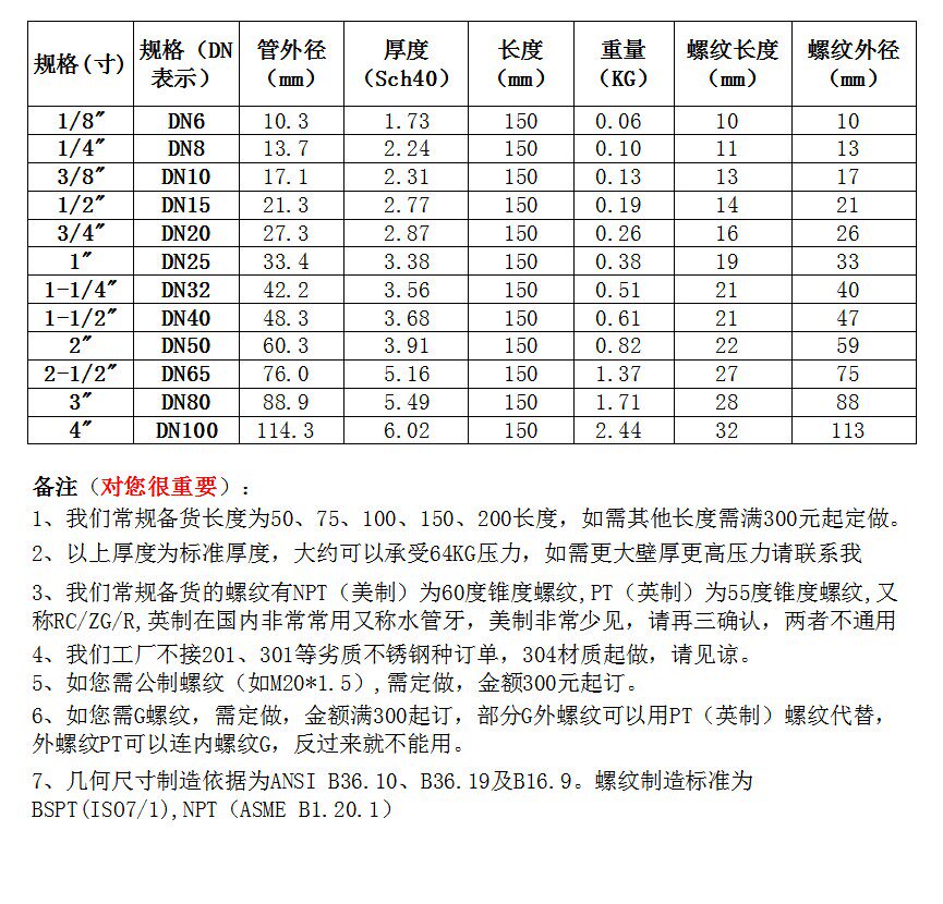 双头管外丝NPT150长64KG高压管件Sch40焊接304316L天佑管业11545由