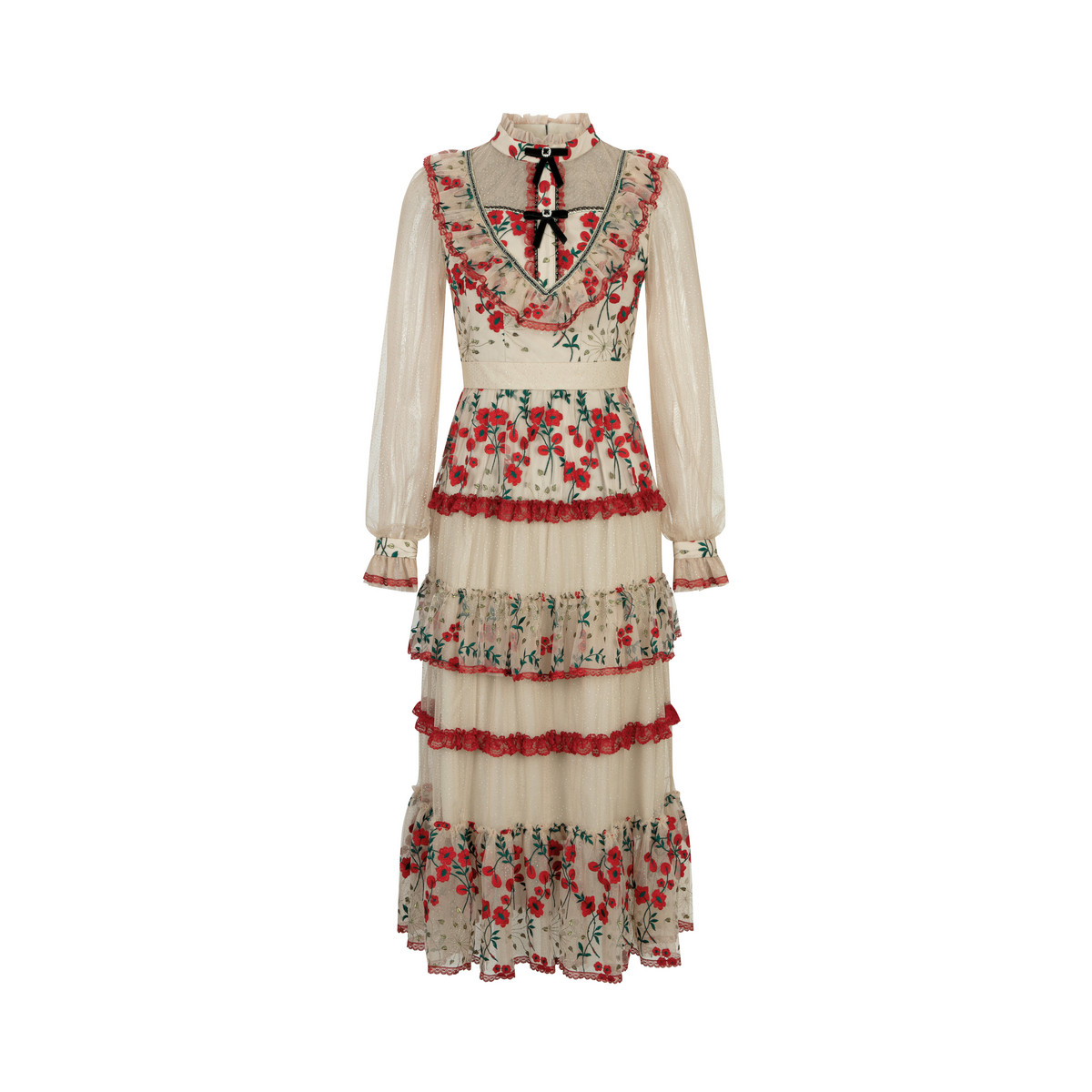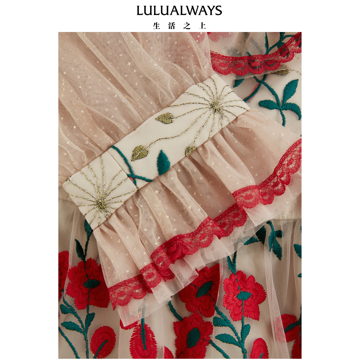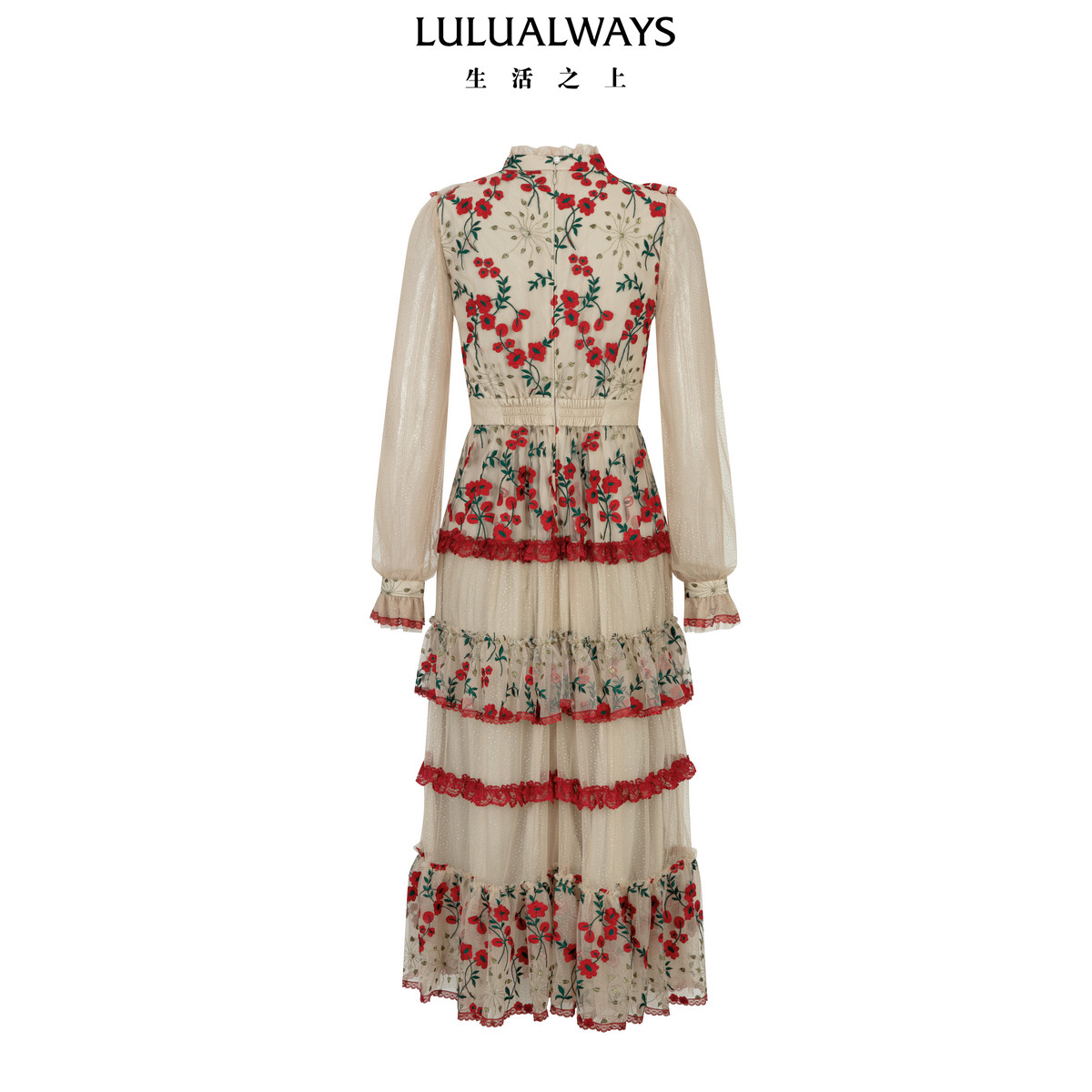 LULUALWAYS我爱露露26春季 法式 浪漫网纱花卉刺绣长款 连衣裙 新款