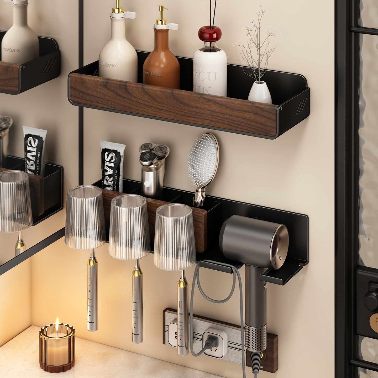 牙刷漱口杯架 胡桃木牙刷置物架免打孔卫生间吹风机支架厕所壁挂式
