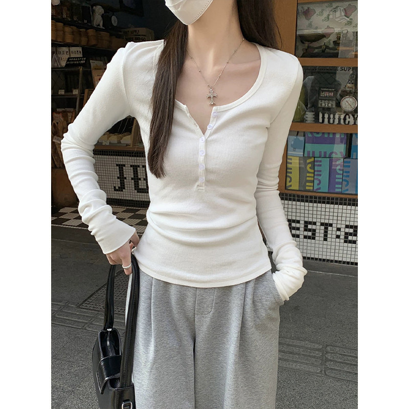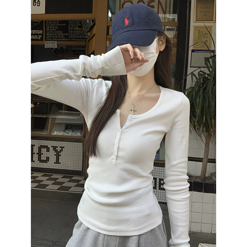 T恤秋修身 正肩内搭上衣 半开领纽扣长袖 MosesQueen魔西女王美式由