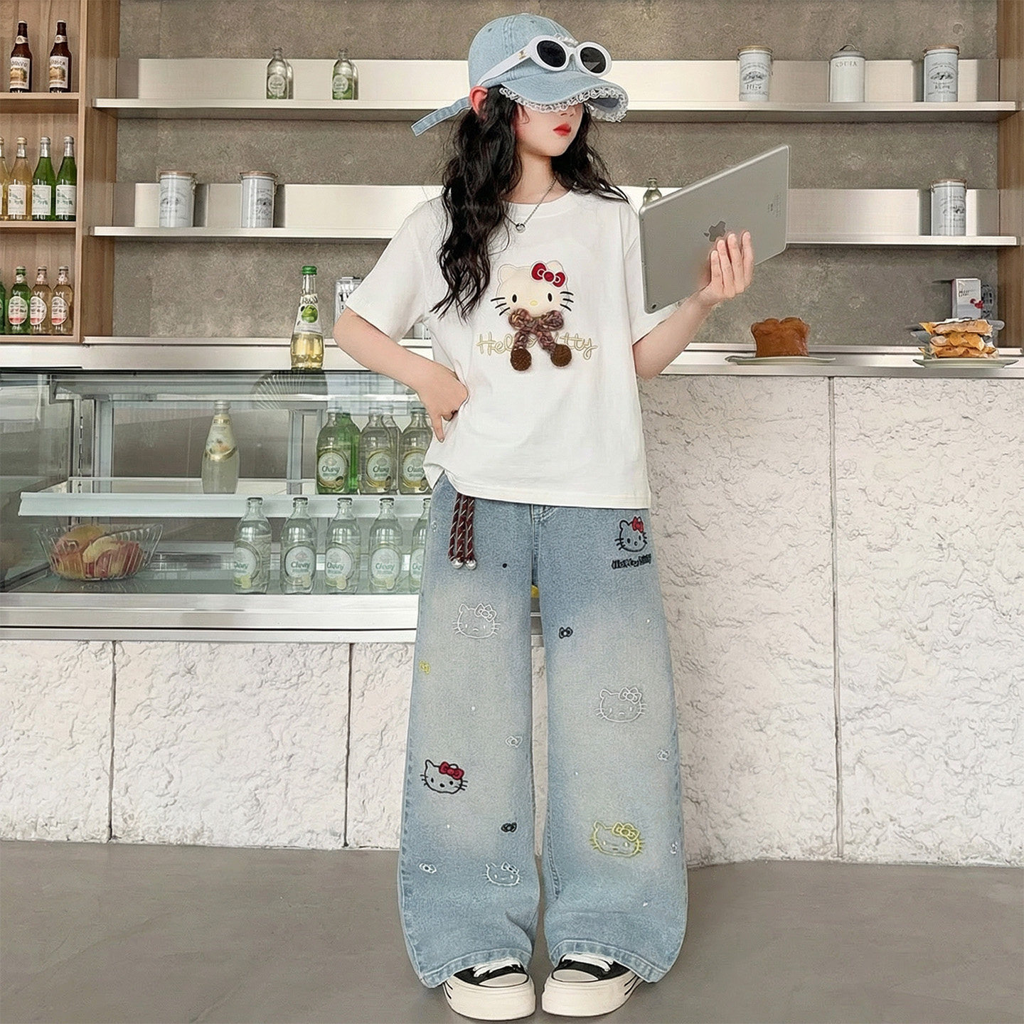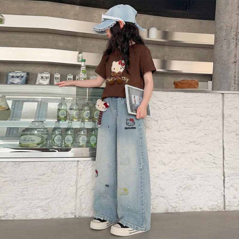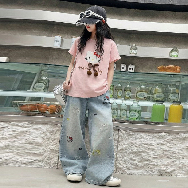牛仔裤 女童夏季 两件套 儿童洋气T恤薄款 2026新款 卡通印花短袖 套装