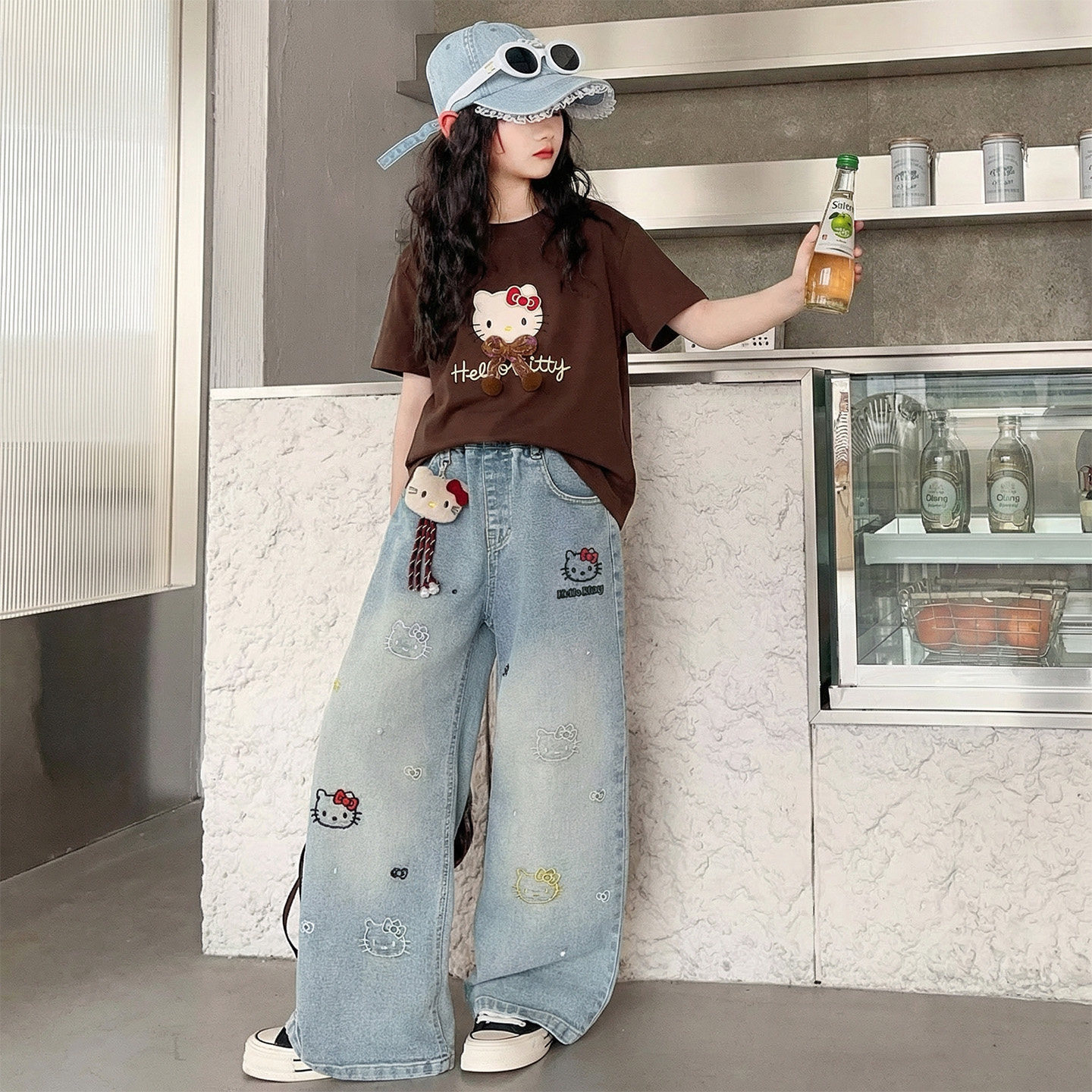 牛仔裤 女童夏季 两件套 儿童洋气T恤薄款 2026新款 卡通印花短袖 套装由